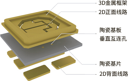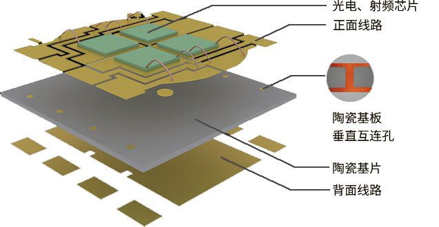 薄膜電路陶瓷封裝基板是一種通過磁控濺射薄膜金屬化與電鍍制程的技術(shù):即根據(jù)應(yīng)用需要,在高導熱的陶瓷基體上,采用薄膜金屬化及影像轉(zhuǎn)移方式制作2D金屬線路,然后采用TCV(Through Ceramic Via) 技術(shù)形成雙面布線間的垂直互連,最后采用堆疊技術(shù)獲得與陶瓷基體結(jié)合緊密的一體式3D金屬框架。基于薄膜電路工藝,通過磁控濺射實現(xiàn)陶瓷表面金屬化,通過電鍍實現(xiàn)銅層和金成的厚度大于10微米以上即DPC(DirectPlateCopper-直接鍍銅基板)。